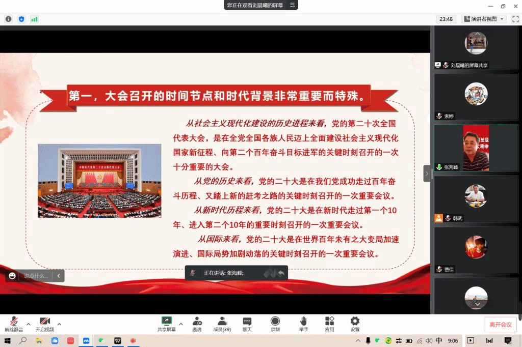 张海峰强调:党的二十大具有鲜明的政治意义、战略意义和世界意义。深入学习宣传贯彻党的二十大精神、深入研究阐释党的二十大理论创新成果,是广大教育工作者一项十分重要的政治任务,要持续推动党的二十大精神在内师落地生根,坚持不懈用习近平新时代中国特色社会主义思想铸魂育人。广大党员干部应坚持用党的创新理论和最新成果武装头脑,坚持不懈从党的二十大报告中汲取思想伟力,切实将党的二十大精神转化为推动公司高质量发展科学思路、务实举措和实际成效。
