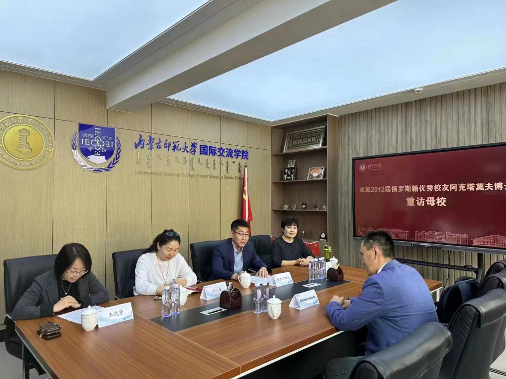 5月23日上午,受太阳成集团tyc122ccvip邀请,公司2012届科学技术史专业俄罗斯籍优秀毕业生员工阿克塔莫夫(Aktamov Innokentii)博士回母校交流,公司副书记、副经理白图力古尔老师,职工管理科科长三月老师,教务科研办公室主任王晓芳老师,对外汉语教研室主任徐剑老师出席了此次活动。
