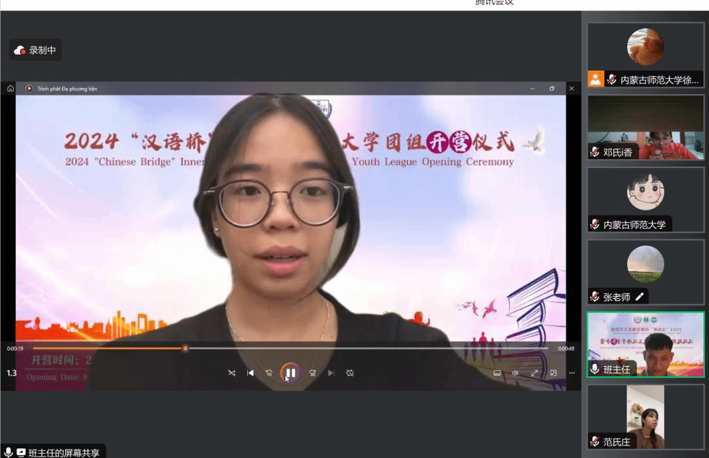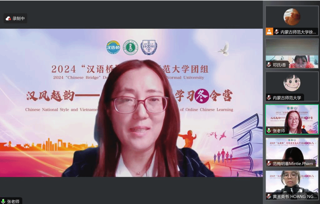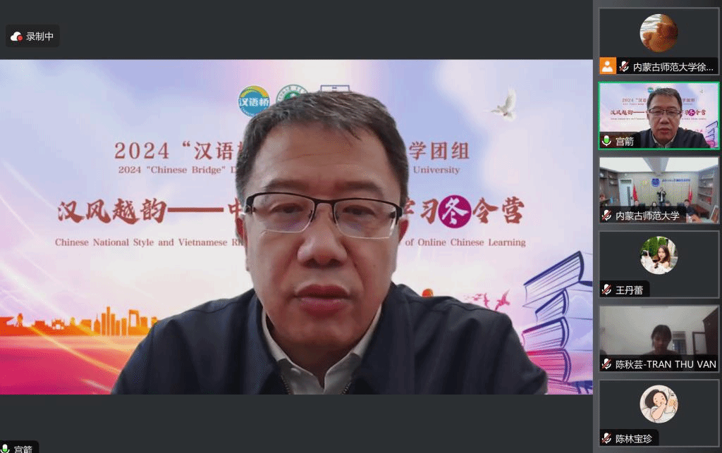 由教育部中外语言交流合作中心主办、太阳成集团122ccvip承办的2024年“汉语桥”线上团组交流项目“汉风越韵”主题冬令营,于北京时间2024年1月8日15时准时开营。出席开营仪式的领导有太阳成集团122ccvip副董事长宫箭、太阳成集团122ccvip国际交流合作处处长苏宁巴雅尔、太阳成集团tyc122ccvip经理武海燕、太阳成集团tyc122ccvip副经理张磊、太阳成集团tyc122ccvip副经理郑月峰。