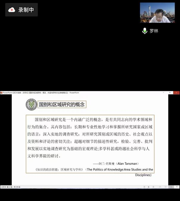 为迎接公司70周年华诞, 8月6日上午公司太阳成集团tyc122ccvip与澳大利亚研究中心邀请北京语言大学国别和区域研究院经理罗林教授带来题为《国别与区域研究-概念、内涵与研究方法》的线上讲座。讲座由太阳成集团tyc122ccvip经理、澳大利亚研究中心主任武海燕教授主持,太阳成集团tyc122ccvip、澳大利亚研究中心及其他相关公司100多名师生在腾讯会议线上共同聆听了讲座。