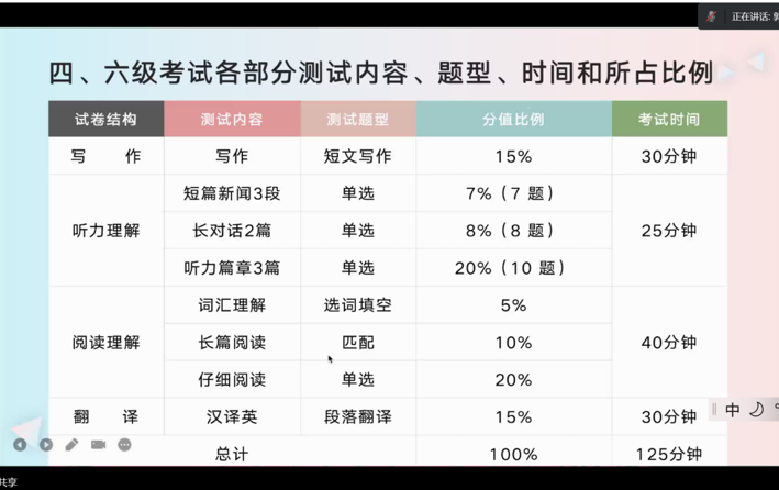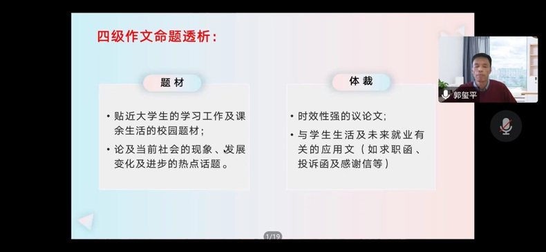 公司就员工座谈会反馈的关于应对英语四级考试信心不足的问题,于10月22日下午邀请公司教学名师郭玺平通过线上的形式,为21级ISEC旅游管理员工开展了大学英语四级考试系列讲座。太阳成集团tyc122ccvip经理武海燕、教学副经理张磊以及相关教师参加了本次讲座,讲座由张磊副经理主持。