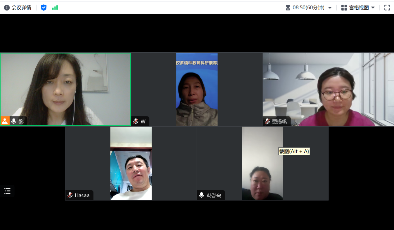 2024年4月11日韩国语教研室举办了本年度第三次教学研讨会。此次会议通过线上平台进行,由教研室主任马文黎老师主持,教师乌日勒、哈斯、贾扬帆以及朴贞淑参加了会议。