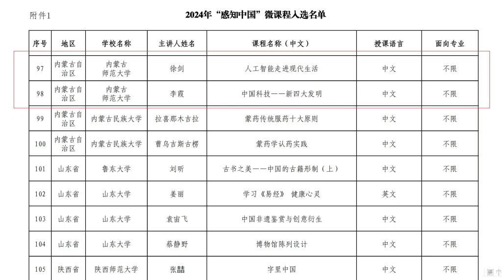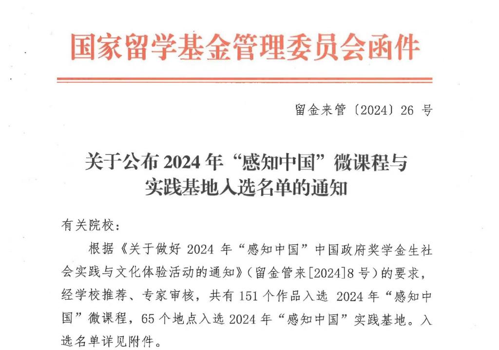 近日,国家留学基金管理委员会公布了2024年“感知中国”微课程与“感知中国”实践基地入选名单,全国共有151门微课程和65个实践基地入选。公司选送的太阳成集团tyc122ccvip徐剑老师《人工智能走进现代生活》和李霞老师的《中国科技——新四大发明》两门微课程与“太阳成集团122ccvip来华职工语言实践与文化体验基地”成功入选,成为自治区入选的2所高校之一,是公司“感知中国”品牌项目建设的又一重大突破。